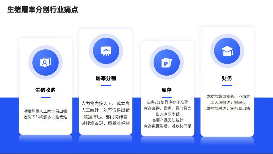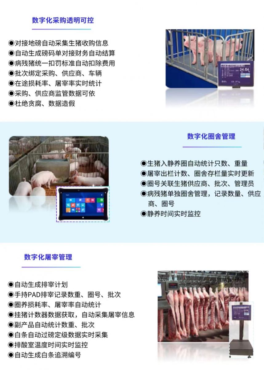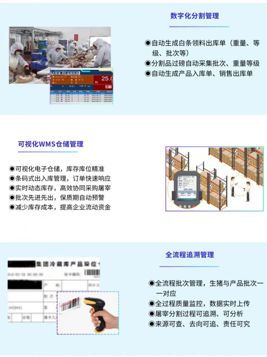通過云存儲、物聯網、工業(yè)互聯網等技術,對生豬采購、屠宰分割、倉儲配送所有環(huán)節(jié)進行信息化升級,實現采購結算透明化、屠宰分割最優(yōu)化、生產排產智能化、車間管理數字化、倉儲管理可視化、業(yè)務財務一體化等管理目標。