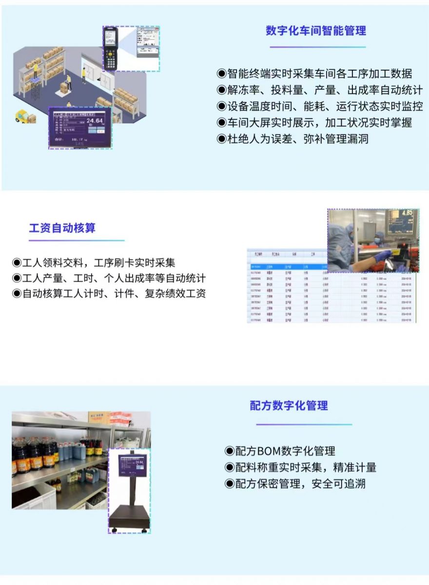 依托云存儲、物聯網、工業互聯網技術,對原料采購、初加工、深加工、冷鏈倉儲等全業務鏈進行信息化升級和改造,實現企業生產成本可控、生產流程責任可究、全程數據電子化、質量可追溯等核心價值,幫助企業提高整體市場競爭力,有效降本增效!