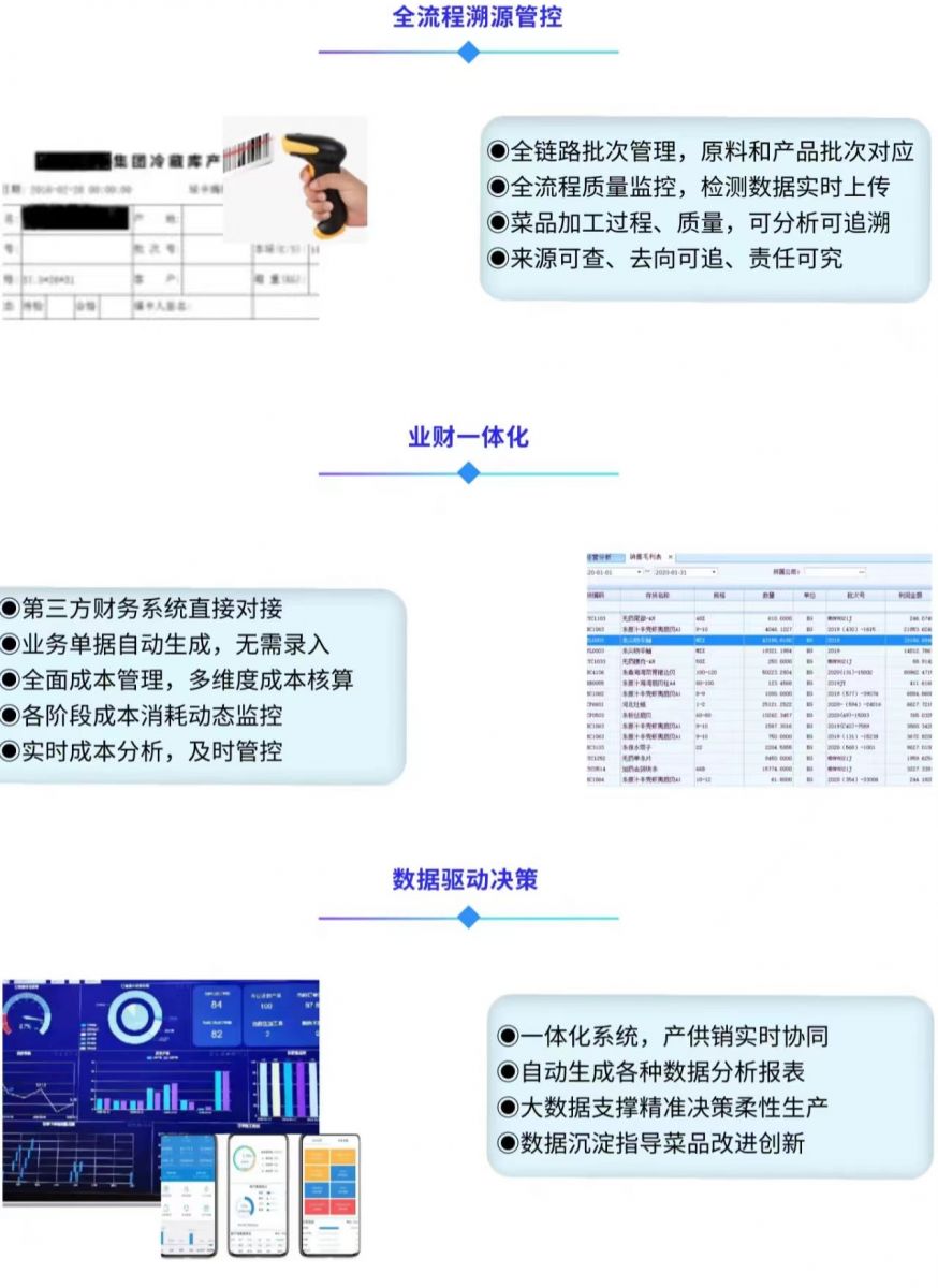 基于物聯(lián)網(wǎng)、工業(yè)互聯(lián)網(wǎng)的技術(shù)與應(yīng)用,打造具備行業(yè)示范標(biāo)桿的預(yù)制菜數(shù)字化工廠,幫助預(yù)制菜生產(chǎn)企業(yè)一站式解決預(yù)制菜采購(gòu)、生產(chǎn)、配送、成本核算等管理難題,實(shí)現(xiàn)預(yù)制菜數(shù)字化智能生產(chǎn)、食品安全區(qū)塊鏈溯源管控,有效提質(zhì)、降本、增效!